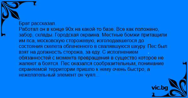 Работал он в конце 90х на какой-то базе. Все как положено, забор, склады. Городская окраина. Местные бомжи притащили им пса, московскую сторожевую, изголодавшегося до состояния скелета облаченного в свалявшуюся шкуру. Пес был взят на должность сторожа, за еду. С исполнением обязанностей с момента превращения в существо которое не жалеют а боятся. Пес оказался сообразительным, понимание охраняемой территории пришло к нему очень быстро, а нежелательный элемент он чуял инстинктивно. Ел все и всегда. Специальные корма для животных, по каким-то причинам отвергнутые домашними любимцами, объедки, кости, огрызки, сухари, словом все. Есть отказавался только лапшу быстрого приготовления, как бы она не называлась, и под каким бы видом не продавалась и позиционировалась. Равно относилось это и к бич-пакетам, вроде Ролтона, и к всевозможным бизнес ланчам, которые едят, если верить рекламе, даже московские менеджеры. Не знаю как менеджеры, но московская сторожевая жрать это отказывалась, как в период наибольшего истощения, так и в дальнейшем. Это пищевое поведение вызывало агрессивное недоумение у сотрудников базы, ввиду предельного истощения пса не имевших повода сказать "Ишь ты, зажралась, тварь", постепенно переросшее в игнорирование продуктов быстрого приготовления. Может собаки и перенимают привычки хозяев, некоторые привычки животных перенимают и хозяева.