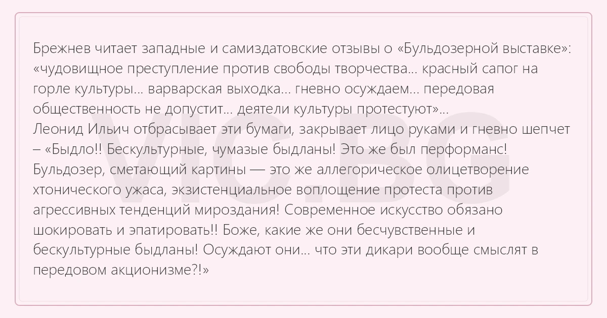 Брежнев читает западные и самиздатовские отзывы о «Бульдозерной выставке»: «чудовищное преступление против свободы творчества... красный сапог на горле культуры... варварская выходка... гневно осуждаем... передовая общественность не допустит... деятели культуры протестуют»... Леонид Ильич отбрасывает эти бумаги, закрывает лицо руками и гневно шепчет – «Быдло!! Бескультурные, чумазые быдланы! Это же был перформанс! Бульдозер, сметающий картины — это же аллегорическое олицетворение хтонического ужаса, экзистенциальное воплощение протеста против агрессивных тенденций мироздания! Современное искусство обязано шокировать и эпатировать!! Боже, какие же они бесчувственные и бескультурные быдланы! Осуждают они... что эти дикари вообще смыслят в передовом акционизме?!»