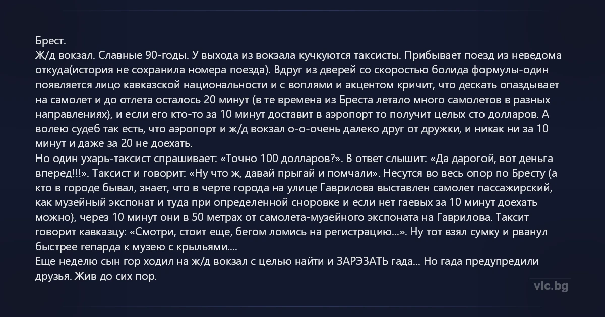 Ж/д вокзал. Славные 90-годы. У выхода из вокзала кучкуются таксисты. Прибывает поезд из неведома откуда(история не сохранила номера поезда). Вдруг из дверей со скоростью болида формулы-один появляется лицо кавказской национальности и с воплями и акцентом кричит, что дескать опаздывает на самолет и до отлета осталось 20 минут (в те времена из Бреста летало много самолетов в разных направлениях), и если его кто-то за 10 минут доставит в аэропорт то получит целых сто долларов. А волею судеб так есть, что аэропорт и ж/д вокзал о-о-очень далеко друг от дружки, и никак ни за 10 минут и даже за 20 не доехать.