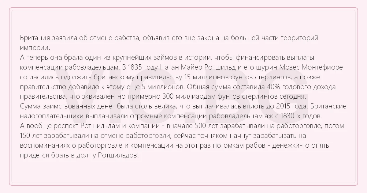 Британия заявила об отмене рабства, объявив его вне закона на большей части территорий империи. А теперь она брала один из крупнейших займов в истории, чтобы финансировать выплаты компенсации рабовладельцам. В 1835 году Натан Майер Ротшильд и его шурин Мозес Монтефиоре согласились одолжить британскому правительству 15 миллионов фунтов стерлингов, а позже правительство добавило к этому еще 5 миллионов. Общая сумма составила 40% годового дохода правительства, что эквивалентно примерно 300 миллиардам фунтов стерлингов сегодня. Сумма заимствованных денег была столь велика, что выплачивалась вплоть до 2015 года. Британские налогоплательщики выплачивали огромные компенсации рабовладельцам аж с 1830-х годов. А вообще респект Ротшильдам и компании - вначале 500 лет зарабатывали на работорговле, потом 150 лет зарабатывали на отмене работорговли, сейчас точняком начнут зарабатывать на воспоминаниях о работорговле и компенсации на этот раз потомкам рабов - денежки-то опять придется брать в долг у Ротшильдов!