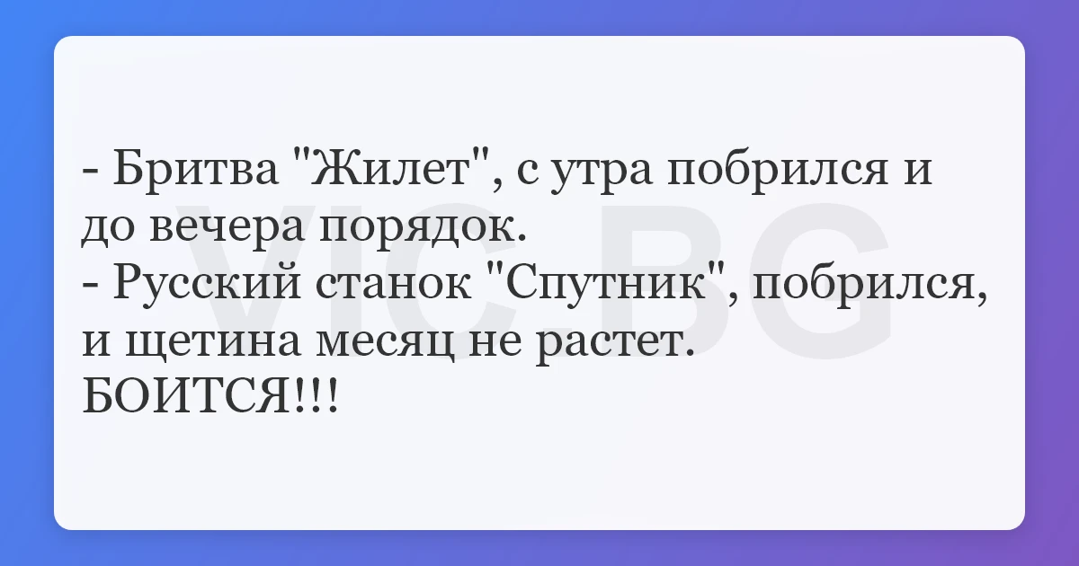 - Русский станок "Спутник", побрился, и щетина месяц не растет.