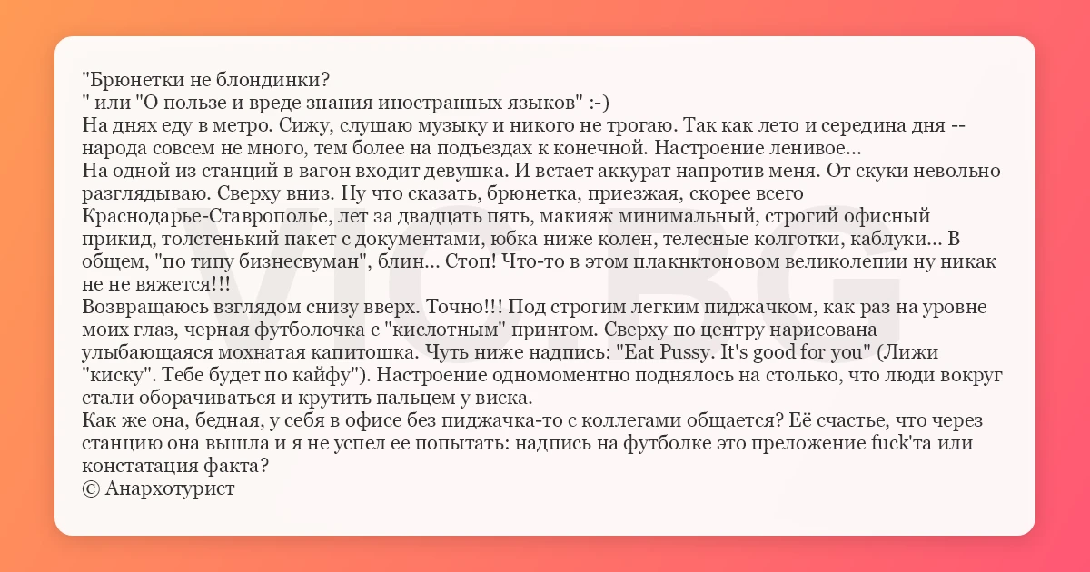 "Брюнетки не блондинки?<br />" или "О пользе и вреде знания иностранных языков" :-)<br />На днях еду в метро. Сижу, слушаю музыку и никого не трогаю. Так как лето и середина дня -- народа совсем не много, тем более на подъездах к конечной. Настроение ленивое...<br />На одной из станций в вагон входит девушка. И встает аккурат напротив меня. От скуки невольно разглядываю. Сверху вниз. Ну что сказать, брюнетка, приезжая, скорее всего Краснодарье-Ставрополье, лет за двадцать пять, макияж минимальный, строгий офисный прикид, толстенький пакет с документами, юбка ниже колен, телесные колготки, каблуки... В общем, "по типу бизнесвуман", блин... Стоп! Что-то в этом плакнктоновом великолепии ну никак не не вяжется!!!<br />Возвращаюсь взглядом снизу вверх. Точно!!! Под строгим легким пиджачком, как раз на уровне моих глаз, черная футболочка с "кислотным" принтом. Сверху по центру нарисована улыбающаяся мохнатая капитошка. Чуть ниже надпись: "Eat Рussy. It's good for you" (Лижи "киску". Тебе будет по кайфу"). Настроение одномоментно поднялось на столько, что люди вокруг стали оборачиваться и крутить пальцем у виска.<br />Как же она, бедная, у себя в офисе без пиджачка-то с коллегами общается? Её счастье, что через станцию она вышла и я не успел ее попытать: надпись на футболке это преложение fuск'та или констатация факта?<br />© Анархотурист
