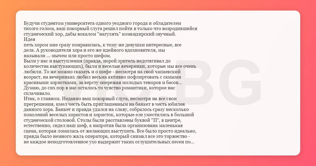 Будучи студентом университета одного уездного города и обладателем тихого голоса, ваш покорный слуга решил пойти в только что возродившийся студенческий хор, дабы вокалом "нагулять" командирский звучный. Идея петь хором мне сразу понравилась, к тому же девушки интересные, все дела. А руководителя хора и его же идейного вдохновителя, мы называли ...-нычем или просто шефом. Были у нас и выступления (правда, порой зритель недотягивал до количества выступающих), были и веселые вечеринки, которые мы все очень любили. То же можно сказать и о шефе - несмотря на свой чапаевский возраст, на вечеринках любил весьма активно пофлиртовать с самыми красивыми хористками, за версту опережая молодых теноров и басов... Думаю, до сих пор в нас осталось то чувство романтики, которое нас сплачивало. Итак, о главном. Недавно ваш покорный слуга, несмотря на все свои прегрешения, имел честь быть приглашенным на банкет в честь юбилея данного хора. Банкет и правда удался на славу, собралось сразу несколько поколений веселых хористов и хористок, которые еле уместились в большой студенческой столовой. Столы были расставлены буквой "П", в центре, естественно, сидел наш шеф, а напротив была организована маленькая сцена, которая ломилась от желающих выступить. Все было просто идеально, правда было немного жаль оператора, который снимал все это торжество - не каждое неподготовленное ухо выдержит таких оглушительных песен по сотне весьма чувственных голосов в партии. И как всегда водится, вот в самый разгар веселья на сцене появляется высокая начальница по культмассовым мероприятиям, и начинает свою речь, т.е. дифирамбы шефу: "... в это сложное время.... ИДЕЯ ТВОРЧЕСТВА... он единственный смог..." и т.п. Да..., вот он, звездный час шефа. И вот он, конец ее выступления: "... в начале... никто не верил... но сейчас мы действительно ВИДИМ, ЧТО ВСЕ У НЕГО УДАЛОСЬ". Поворот видеокамеры на шефа - и что же мы видим: Вокруг шефа группа красивых хористок, шеф приобнял ближайших, а лицо расплылось в такой широченной улыбке, что позавидовали бы даже самые оптимистичные чеширские коты... ... Шквал аплодисментов мужской половины зала.