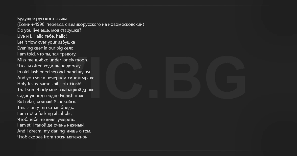 Будущее русского языка (Есенин-1998, перевод с великорусского на новомосковский) Do you live еще, моя старушка? Live и I. Hallo тебе, hallo! Let it flow over your избушка Evening свет in our big село. I am told, что ты, тая тревогу, Miss me шибко under lonely moon, Что ты often ходишь на дорогу In old-fashioned second-hand шушун. And you see в вечернем синем мраке Holy Jesus, same shiт - oh, Gosh! - That somebody мне в кабацкой драке Саданул под сердце Finnish нож. But relax, родная! Успокойся. This is only тягостная бредь. I am not a fuскing alcoholic, Чтоб, тебя не видя, умереть. I am still такой де очень нежный, And I dream, my darling, лишь о том, Чтоб скорее from тоски мятежной To get back in низенький наш дом. I'll return, когда раскинет ветви Our garden - старый белый сад. But I bet you, mama, на рассвете Wake me not like восемь лет назад. Do not wake того, что отмечалось, Don't excite того, что не сбылось, - Слишком early losses and усталость To experience мне привелось. Don't teach me how to pray. Не надо! To the old возврата больше нет. You're my only помощь & отрада, You're my only несказанный свет. So forget about your тревога, Не грусти and I shall come back soon. Don't go so often to дорога In old-fashioned second-hand шушун. 22.11.1998