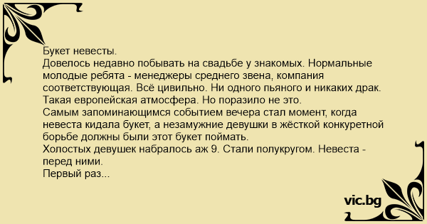 Первый раз забросила невеста букет в массы. Описав правильную параболу цветы шлёпнулись у ног одной из девиц.