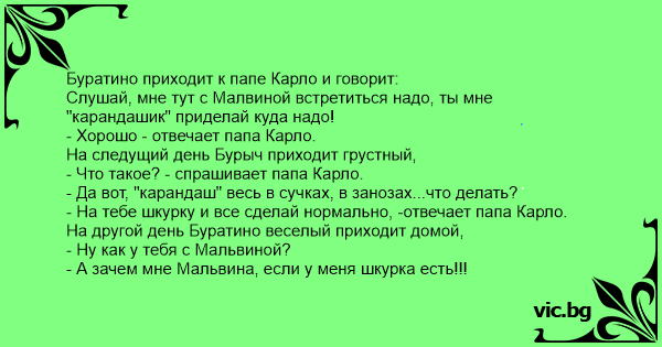 - На тебе шкурку и все сделай нормально, -отвечает папа Карло.