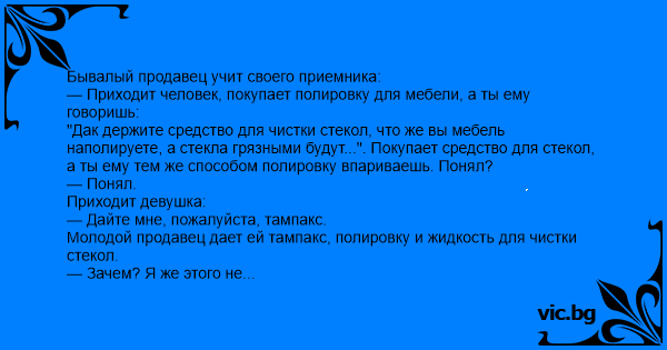 — Приходит человек, покупает полировку для мебели, а ты ему говоришь: