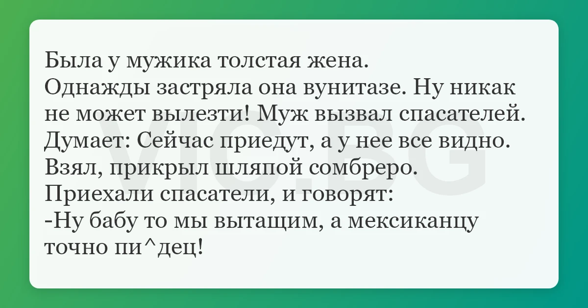 Была у мужика толстая жена. Однажды застряла она вунитазе. Ну никак не может вылезти! Муж вызвал спасателей. Думает: Сейчас приедут, а у нее все видно. Взял, прикрыл шляпой сомбреро. Приехали спасатели, и говорят: -Ну бабу то мы вытащим, а мексиканцу точно пи^дец!