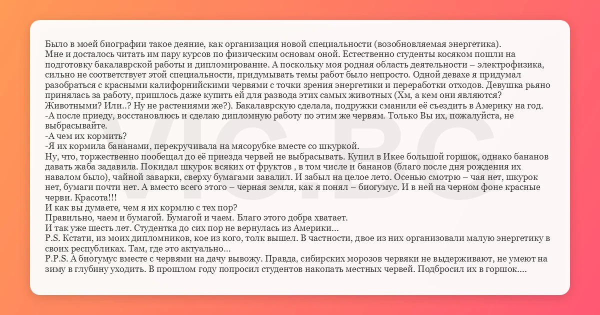 Было в моей биографии такое деяние, как организация новой специальности (возобновляемая энергетика). Мне и досталось читать им пару курсов по физическим основам оной. Естественно студенты косяком пошли на подготовку бакалаврской работы и дипломирование. А поскольку моя родная область деятельности – электрофизика, сильно не соответствует этой специальности, придумывать темы работ было непросто. Одной девахе я придумал разобраться с красными калифорнийскими червями с точки зрения энергетики и переработки отходов. Девушка рьяно принялась за работу, пришлось даже купить ей для развода этих самых животных (Хм, а кем они являются? Животными? Или..? Ну не растениями же?). Бакалаврскую сделала, подружки сманили её съездить в Америку на год. -А после приеду, восстановлюсь и сделаю дипломную работу по этим же червям. Только Вы их, пожалуйста, не выбрасывайте. -А чем их кормить? -Я их кормила бананами, перекручивала на мясорубке вместе со шкуркой. Ну, что, торжественно пообещал до её приезда червей не выбрасывать. Купил в Икее большой горшок, однако бананов давать жаба задавила. Покидал шкурок всяких от фруктов , в том числе и бананов (благо после дня рождения их навалом было), чайной заварки, сверху бумагами завалил. И забыл на целое лето. Осенью смотрю – чая нет, шкурок нет, бумаги почти нет. А вместо всего этого – черная земля, как я понял – биогумус. И в ней на черном фоне красные черви. Красота!!! И как вы думаете, чем я их кормлю с тех пор? Правильно, чаем и бумагой. Бумагой и чаем. Благо этого добра хватает. И так уже шесть лет. Студентка до сих пор не вернулась из Америки... P.S. Кстати, из моих дипломников, кое из кого, толк вышел. В частности, двое из них организовали малую энергетику в своих республиках. Там, где это актуально… P.P.S. А биогумус вместе с червями на дачу вывожу. Правда, сибирских морозов червяки не выдерживают, не умеют на зиму в глубину уходить. В прошлом году попросил студентов накопать местных червей. Подбросил их в горшок. Может новую породу выведу…