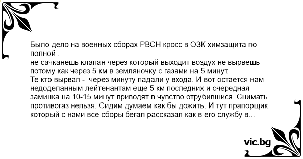Те кто вырвал - через минуту падали у входа. И вот остается нам недоделанным лейтенантам еще 5 км последних и очередная заминка на 10-15 минут приводят в чувство отрубившися. Снимать противогаз нельзя. Сидим думаем как бы дожить. И тут прапорщик который с нами все сборы бегал рассказал как в его службу в столовой давали горошницу и селедку на обед. А потом начальству вдруг приспичило провести марш бросок в ОЗК.