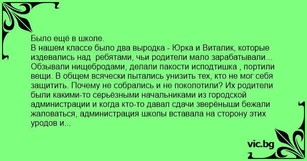 В нашем классе было два выродка - Юрка и Виталик, которые издевались над ребятами, чьи родители мало зарабатывали... Обзывали нищебродами, делали пакости исподтишка , портили вещи. В общем всячески пытались унизить тех, кто не мог себя защитить. Почему не собрались и не поколотили? Их родители были какими-то серьёзными начальниками из городской администрации и когда кто-то давал сдачи зверёныши бежали жаловаться, администрация школы вставала на сторону этих уродов и посмевший защищаться получал ещё и оттуда... В нашем классе особенно сильно доставалось одной девочке, которую воспитывала бабушка и мне. Из-за плохого зрения всегда сидел на первой парте и во время урока в спину летел всякий мусор и жеваная бумага.