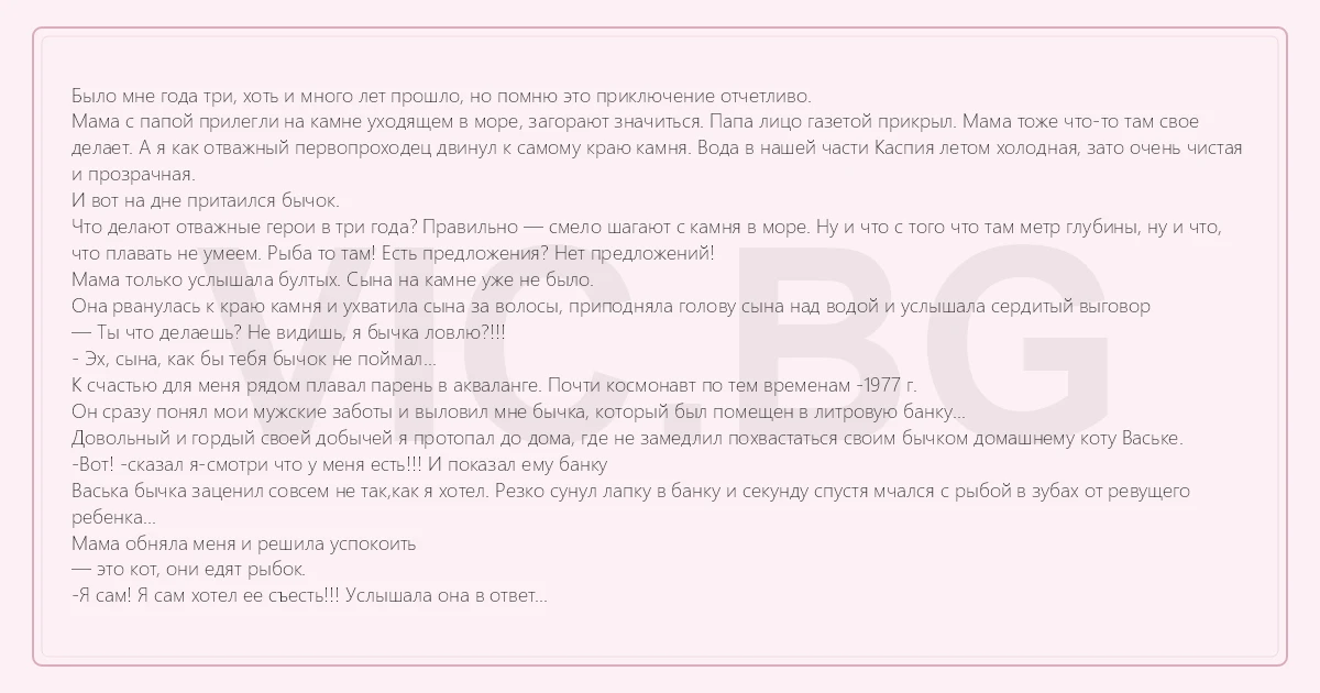 Было мне года три, хоть и много лет прошло, но помню это приключение отчетливо. Мама с папой прилегли на камне уходящем в море, загорают значиться. Папа лицо газетой прикрыл. Мама тоже что-то там свое делает. А я как отважный первопроходец двинул к самому краю камня. Вода в нашей части Каспия летом холодная, зато очень чистая и прозрачная. И вот на дне притаился бычок. Что делают отважные герои в три года? Правильно — смело шагают с камня в море. Ну и что с того что там метр глубины, ну и что, что плавать не умеем. Рыба то там! Есть предложения? Нет предложений! Мама только услышала бултых. Сына на камне уже не было. Она рванулась к краю камня и ухватила сына за волосы, приподняла голову сына над водой и услышала сердитый выговор — Ты что делаешь? Не видишь, я бычка ловлю?!!! - Эх, сына, как бы тебя бычок не поймал... К счастью для меня рядом плавал парень в акваланге. Почти космонавт по тем временам -1977 г. Он сразу понял мои мужские заботы и выловил мне бычка, который был помещен в литровую банку... Довольный и гордый своей добычей я протопал до дома, где не замедлил похвастаться своим бычком домашнему коту Ваське. -Вот! -сказал я-смотри что у меня есть!!! И показал ему банку Васька бычка заценил совсем не так,как я хотел. Резко сунул лапку в банку и секунду спустя мчался с рыбой в зубах от ревущего ребенка... Мама обняла меня и решила успокоить — это кот, они едят рыбок. -Я сам! Я сам хотел ее съесть!!! Услышала она в ответ...