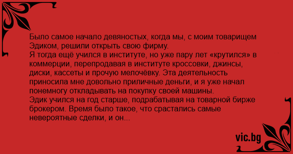 Было самое начало девяностых, когда мы, с моим товарищем Эдиком, решили открыть свою фирму.