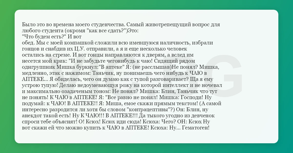 однгруппник Мишка буркнул:"В аптеке" Я: (не расслышав)Не понял? Мишка,