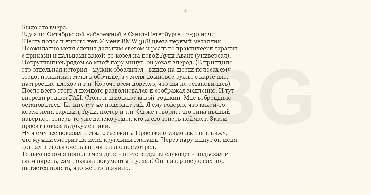 Было это вчера. Еду я по Октябрьской набережной в Санкт-Петербурге. 12-30 ночи. Шесть полос и никого нет. У меня BMW 318i цвета черный металлик. Неожиданно меня слепит дальним светом и реально практически таранит с криками и пальцами какой-то козел на новой Ауди Авант (универсал). Покрутившись рядом со мной пару минут, он уехал вперед. (В принципе это отдельная история - мужик обозлился - видно на шести полосах ему тесно, прижимал меня к обочине, а у меня помповое ружье с картечью, настроение плохое и т.п. Короче всем повезло, что мы не остановились). После всего этого я немного разволновался и соображал медленно. И тут впереди родная ГАИ. Стоят и шмонают какой-то джип. Мне взбрендило остановиться. Ко мне тут же подходит гай. Я ему говорю, что какой-то козел меня таранил, Ауди, номер и т.п. Он же говорит, что типа пьяный наверное, теперь-то уже далеко уехал, кто ж его теперь поймает. Затем просит показать документики. Ну я ему все показал и стал отъезжать. Проезжаю мимо джипа и вижу, что мужик смотрит на меня круглыми глазами. Через пару минут он меня догнал и снова очень внимательно посмотрел. Только потом я понял в чем дело - он-то видел следующее - подъехал к гаям парень, сам показал документы и уехал! Он, наверное до сих пор пытается понять, что же это значило.