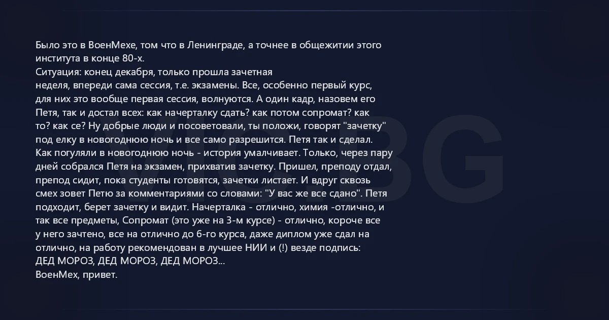 Было это в ВоенМехе, том что в Ленинграде, а точнее в общежитии этого института в конце 80-х. Ситуация: конец декабря, только прошла зачетная неделя, впереди сама сессия, т.е. экзамены. Все, особенно первый курс, для них это вообще первая сессия, волнуются. А один кадр, назовем его Петя, так и достал всех: как начерталку сдать? как потом сопромат? как то? как се? Ну добрые люди и посоветовали, ты положи, говорят "зачетку" под елку в новогоднюю ночь и все само разрешится. Петя так и сделал. Как погуляли в новогоднюю ночь - история умалчивает. Только, через пару дней собрался Петя на экзамен, прихватив зачетку. Пришел, преподу отдал, препод сидит, пока студенты готовятся, зачетки листает. И вдруг сквозь смех зовет Петю за комментариями со словами: "У вас же все сдано". Петя подходит, берет зачетку и видит. Начерталка - отлично, химия -отлично, и так все предметы, Сопромат (это уже на 3-м курсе) - отлично, короче все у него зачтено, все на отлично до 6-го курса, даже диплом уже сдал на отлично, на работу рекомендован в лучшее НИИ и (!) везде подпись: ДЕД МОРОЗ, ДЕД МОРОЗ, ДЕД МОРОЗ... ВоенМех, привет.