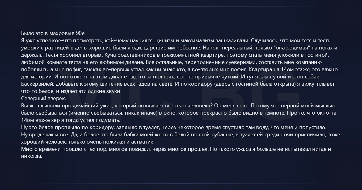Было это в махровые 90е. Я уже успел кое-что посмотреть, кой-чему научился, цинизм и максимализм зашкаливали. Случилось, что мои тетя и тесть умерли с разницей в день, хорошие были люди, царствие им небесное. Напряг нереальный, только "она родимая" на ногах и держала. Тестя хоронил вторым. Куча родственников в трехкомнатной квартире, поэтому спать меня уложили в гостиной, любимой комнате тестя на его любимом диване. Все остальные, переполненные суевериями, составить мне компанию побоялись, а мне пофиг, так как во-первых устал как ни знаю кто, а во-вторых мне пофиг. Квартира на 14ом этаже, это важно для истории. И вот сплю я на этом диване, где-то за полночь, сон по привычке чуткий. И тут я слышу вой и стон собак Баскервилей, добавьте к этому шипение всех гадов на свете. И по коридору (дверь с гостиной была открыта) я вижу, плывет что-то белое, и издает эти адские звуки. Северный зверек. Вы же слышали про дичайший ужас, который сковывает все тело человека? Он меня спас. Потому что первой моей мыслью было съебываться (именно съебываться, никак иначе) в окно, которое прекрасно было видно в темноте. Про то, что окно на 14ом этаже хер я тогда успел подумать. Ну это белое проплыло по коридору, заплыло в туалет, через некоторое время спустило там воду, что меня и попустило. Ну вроде как и все. Да, а белое это была бабка моей жены в белой ночной рубашке, в туалет ей среди ночи приспичило, тоже хороший человек, только очень пожилая и астматик. Много времени прошло с тех пор, многое повидал, через многое прошел. Но такого ужаса я больше не испытавал нигде и никогда.