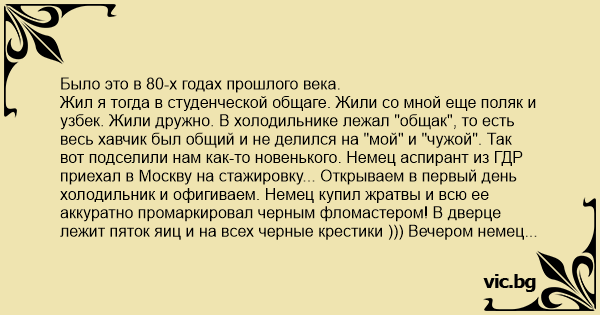 Жил я тогда в студенческой общаге. Жили со мной еще поляк и узбек. Жили дружно. В холодильнике лежал "общак", то есть весь хавчик был общий и не делился на "мой" и "чужой". Так вот подселили нам как-то новенького. Немец аспирант из ГДР приехал в Москву на стажировку... Открываем в первый день холодильник и офигиваем. Немец купил жратвы и всю ее аккуратно промаркировал черным фломастером! В дверце лежит пяток яиц и на всех черные крестики ))) Вечером немец открыл холодильник и офигевать настал его черед... На его яйцах вместо крестиков была подрисована черная свастика, а на наших яйцах красовались красные звезды