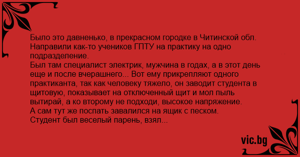 Был там специалист электрик, мужчина в годах, а в этот день еще и после вчерашнего... Вот ему прикрепляют одного практиканта, так как человеку тяжело, он заводит студента в щитовую, показывает на отключенный щит и мол пыль вытирай, а ко второму не подходи, высокое напряжение.