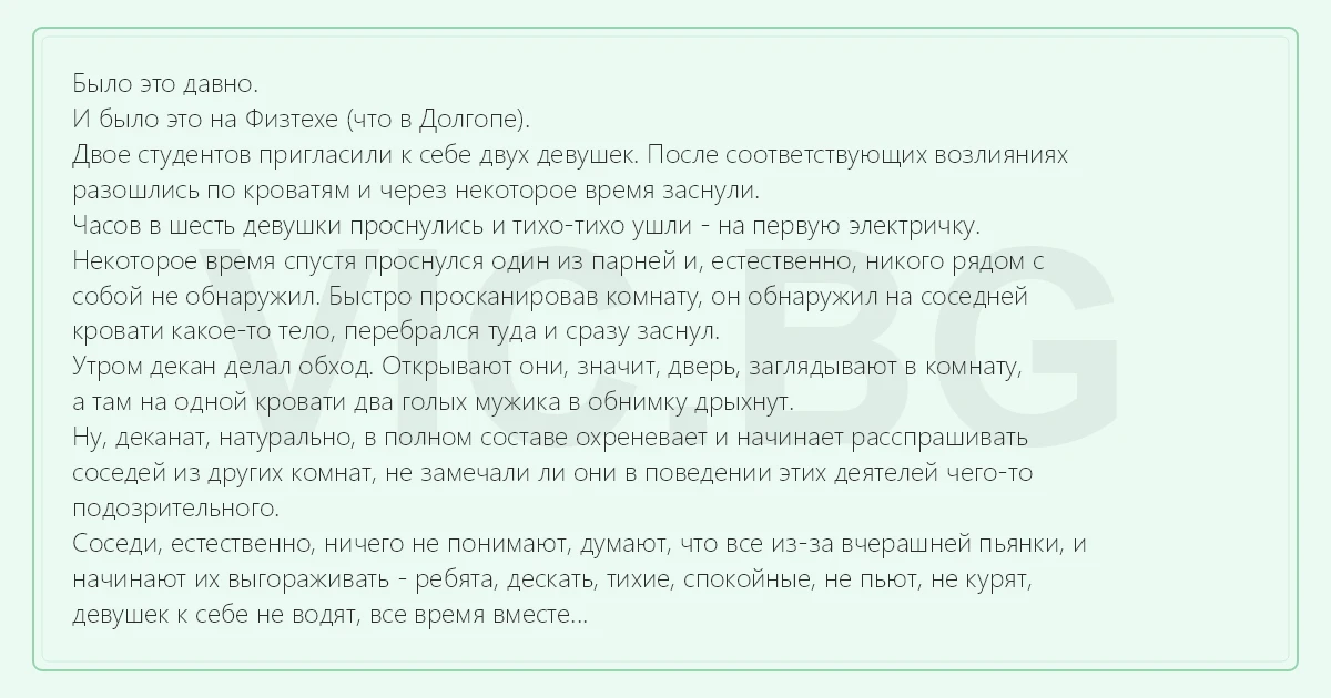 Было это давно. И было это на Физтехе (что в Долгопе). Двое студентов пригласили к себе двух девушек. После соответствующих возлияниях разошлись по кроватям и через некоторое время заснули. Часов в шесть девушки проснулись и тихо-тихо ушли - на первую электричку. Некоторое время спустя проснулся один из парней и, естественно, никого рядом с собой не обнаружил. Быстро просканировав комнату, он обнаружил на соседней кровати какое-то тело, перебрался туда и сразу заснул. Утром декан делал обход. Открывают они, значит, дверь, заглядывают в комнату, а там на одной кровати два голых мужика в обнимку дрыхнут. Ну, деканат, натурально, в полном составе охреневает и начинает расспрашивать соседей из других комнат, не замечали ли они в поведении этих деятелей чего-то подозрительного. Соседи, естественно, ничего не понимают, думают, что все из-за вчерашней пьянки, и начинают их выгораживать - ребята, дескать, тихие, спокойные, не пьют, не курят, девушек к себе не водят, все время вместе...