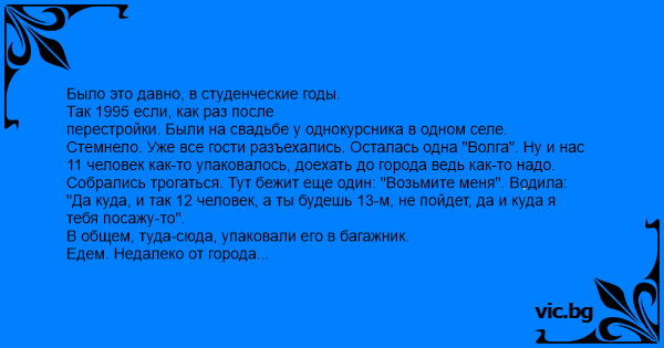свадьба, мол". "А вот если бы вас было 13, то я бы вас отпустил". Тут