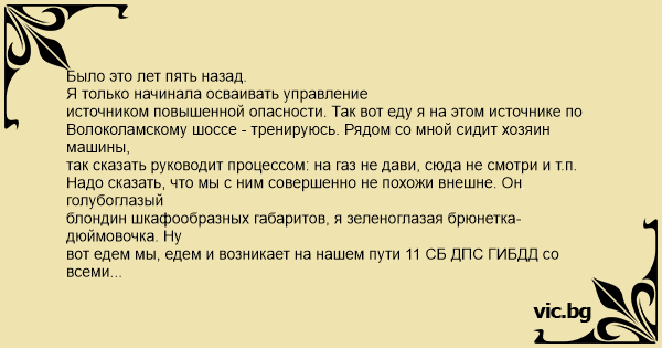 Было это лет пять назад. Я только начинала осваивать управление источником повышенной опасности. Так вот еду я на этом источнике по Волоколамскому шоссе - тренируюсь. Рядом со мной сидит хозяин машины, так сказать руководит процессом: на газ не дави, сюда не смотри и т.п. Надо сказать, что мы с ним совершенно не похожи внешне. Он голубоглазый блондин шкафообразных габаритов, я зеленоглазая брюнетка-дюймовочка. Ну вот едем мы, едем и возникает на нашем пути 11 СБ ДПС ГИБДД со всеми вытекающими из этого последствиями. Это самое последствие взмахом полосатой палочки предлагает нам прижаться к обочине. Надо полагать, для светской беседы. Прижимаемся. Подходит. Представляется. Излагает: ваши документики. Я дисциплинированно подаю ему в окошко документы и собираюсь объяснить, что машина не моя, я тренируюсь, а хозяин сидит рядом. Но тут, посмотрев на права хозяина машины, бравый сержант выдает следующее: что-то вы девушка не похожи на свою фотографию. Пауза для осмысления сказанного. Далее следует амбула. Тут Остапа понесло! Я очень вежливо, стараясь не засмеяться, говорю ему, что документы я не успела поменять после операции по смене пола. Сержант застыл в немом вопросе. Потом все же спросил: чего? Говорю ему: понимаете, была мужчиной, но всегда хотела быть женщиной, вот денег поднакопила и операцию сделала, правда хорошо получилось. А документы еще не все поменять успела, вот и не похожа на фотографию. Хозяин машины при этом практически сидит у меня на коленях (почти 1,5 центнера), высунув фейс в окошко и пыжась от смеха. Сержант еще несколько раз внимательно сверил меня с фотографией, нашел таки сходство, и сказал: ладно, проезжайте, но документы надо вовремя менять. Проехали мы метро 200 и долго, долго пытались перевести дыхание от смеха.