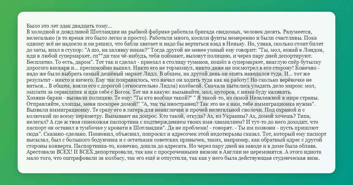 Было это лет эдак двадцать тому... В холодной и дождливой Шотландии на рыбной фабрике работала бригада свидомых, человек десять. Разумеется, нелегально (в то время это было легко и просто). Работали много, косили фунты немеренно и были счастливы. Пока одному всё не надоело и он решил, что бабла хватает и надо бы вертаться взад в Неньку. Но, узнав, сколько стоит билет до хаты, впал в ступор: "А шо, на халявку никак?" Тогда другой не менее умный ему говорит: "Ты, мол, езжай в Лондон, иди в любой супермаркет, сп**ди там чё-нибудь, тебя поймают, вызовут полицию, и через пару дней депортируют. Бесплатно. То есть, даром". Тот так и сделал - приехал в столицу туманов, пошёл в супермаркет, внаглую спёр бутылку дорогого вискаря и... преспокойно вышел. Никто его не тормознул, никто даже не посмотрел в его сторону! Конечно - надо же было выбрать самый дешёвый маркет Лидл. В общем, на другой день он опять наведался туда. И... тот же результат - никто и ничего. Ему так понравилось, что начал он ходить туда как на работу! Но сколько верёвочке не виться... В общем, взяли его с дорогой (относительно Лидла) колбасой. Сначала пытались уладить дело миром: мол, заплати за сервилатик и иди себе с Богом. Тот ни в какую: вызывайте, мол, мусоров, с ними буду калякать. Хозяин-барин - вызвали полицию. Те ему: "Ты кто вообще такой?" " Я такой-то, из самой Незалежной в мире страны. Отправляйте, хлопцы, меня поскорее домой!" "А, так ты иностранец? Так это не к нам, тебе иммиграционка нужна". Вызвали иммиграционку. Те сразу его в лагерь для неангличан и прочей нелегальной сволочи. Под охраной и с колючкой по всему периметру. Вызывают на допрос. Кто такой, откуда? Ах, из Украины? Ах, домой хочешь? Типа, нелегал? А где ж твоя синекожая паспортина с подтверждением твоих имя-хвамилием? И тут-то до него доходит, что паспорт он оставил в тумбочке у кровати в Шотландии". Да не проблема! - говорят. - Ты им позвони - пусть пришлют сюда". Сказано-сделано. Позвонил, объяснил, попросил и адресочек этой недотюрьмы сказал. Тот, который ему паспорт высылал, был с большого бодунчика и с остатками советских привычек, таких, например, как обратный адрес с другой стороны конверта. Паспортинка-то, конечно, дошла до адресата. Но через пару дней на заводе и в доме была облава. Арестовали ВСЕХ! И ВСЕХ депортировали, так как с просроченными визами в Англии не церемонятся. А этого идиота мало того, что оштрафовали за колбасу, так его ещё и отпустили, так как у него была действующая студенческая виза.