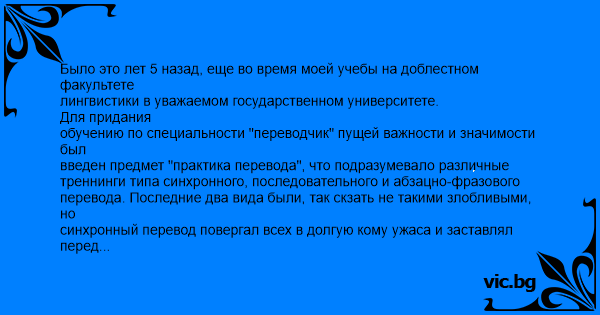 Было это лет 5 назад, еще во время моей учебы на доблестном факультете лингвистики в уважаемом государственном университете. Для придания обучению по специальности "переводчик" пущей важности и значимости был введен предмет "практика перевода", что подразумевало различные треннинги типа синхронного, последовательного и абзацно-фразового перевода. Последние два вида были, так скзать не такими злобливыми, но синхронный перевод повергал всех в долгую кому ужаса и заставлял перед началом пары запасаться вазелином. А надо отметить, что преподаватель, ведший предмет, редко когда удостаивал кого-либо лестным отзывом, и часто все оказывались "полными дебилами, окончившими курсы рукоделия при церковно-приходской школе". Так вот, в один из дней, осознав приближающуюся неизбежность, все поплелись на треннинг по синхронному переводу. И надо же было, чтоб выбор препода пал на мою подругу, как на первую жертву истязания. Препод усадил ее рядом с собой и сказал: "Ну, что, Наташа, займемся делом." По рядам пробежал нервный смешок. И экзекуция началась. (Люди, сведующие в этом вопросе, знают, что при синхронном переводе отставание переводчика от говорящего должно быть не больше 2 простых предложений)Естественно, несчастная студентка, потея и почти падая в обморок, за преподом не успела. И замолчала, не допереводив предложения четыре. Группа замерла в ожидании суровой оценки преподавателя, который внимательно посмотрел на девушку и ехидно выдал: "Наташа, а почему Вы не кончили, когда я уже кончил?" Эффект был колоссальный. *имя главной героини изменено тем, кто узнал историю, горячий привет