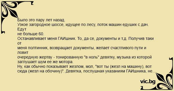 Было это пару лет назад. Узкое загородное шоссе, идущее по лесу, поток машин едуших с дач. Едут не больше 60. Останавливает меня ГАИшник. То, да се, документы и т.д. Получив таки от меня полтинник, возвращает документы, желает счастливого пути и ловит очередную жертву - тонированную "в ноль" девятку, музыка из которой заглушает шум ее же мотора. Ну, как обычно показывает жезлом, мол, "вот ты (жезл на машину), вот сюда (жезл на обочину)". Девятка, послушная указаниям ГАИшника, не снижая скорости, повторяет маневра жезла и, перелетев через канаву, уезжает в лес. Останавливается в кустах. Немая сцена. ГАИшник роняет жезл и открыв рот смотрит на "картину маслом". Открывается дверь и оттуда, под грохот музыки, вываливается совершенно "никакой" водила. - Командир! - изумленно говорит водила, - так тут же нет дороги! Когда я смог начать движение, ГАИшники еще хохотали.