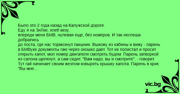 Было это 2 года назад на Калужской дороге. Еду я на ЗиЛке, хлеб везу, впереди меня БМВ, нулевая еще, без номеров. И так неспеша добрались до поста, где нас тормознул гаишник. Выхожу из кабины и вижу - парень в БМВухе документы гаю через окошко дает. Тот их полистал и просит открыть капот, мол номер двигателя смотреть будем. Парень затворкой из салона щелкнул, а сам сидит. "Вам надо, вы и смотрите", - говорит. Тут гай начинает своим жезлом ковырять крышку капота. Парень в крик: "Вы мне сейчас так машину изуродуете, у вас что, руки из жопы растут?" Гай: "Я не хочу пачкаться о твою грязь". Тогда парень берет тряпку и швыряет ею в гая. Гай: "У-у-у, с тобой мы долго будем разбираться", и поворачивается ко мне - "Открывай фургон, может у тебя там бандиты сидят?" "Ну да", - говорю, - "Впереди пахан на иномарке, а я за ним братков в хлебной будке везу".