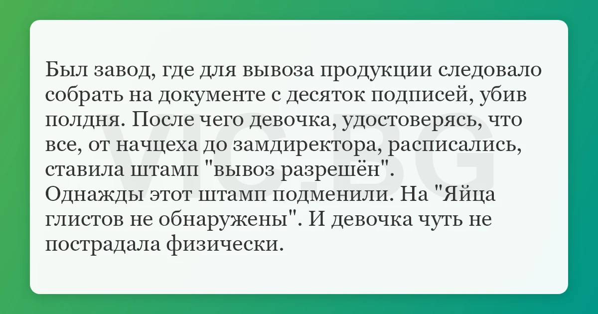 Был завод, где для вывоза продукции следовало собрать на документе с десяток подписей, убив полдня. После чего девочка, удостоверясь, что все, от начцеха до замдиректора, расписались, ставила штамп "вывоз разрешён".