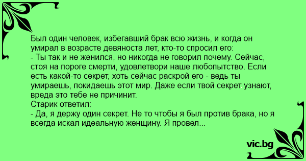 Был один человек, избегавший брак всю жизнь, и когда он умирал в возрасте девяноста лет, кто-то спросил его: - Ты так и не женился, но никогда не говорил почему. Сейчас, стоя на пороге смерти, удовлетвори наше любопытство. Если есть какой-то секрет, хоть сейчас раскрой его - ведь ты умираешь, покидаешь этот мир. Даже если твой секрет узнают, вреда это тебе не причинит. Старик ответил: - Да, я держу один секрет. Не то чтобы я был против брака, но я всегда искал идеальную женщину. Я провел все время в поисках, и так пролетела моя жизнь. - Но неужели на всей огромной планете, населенной миллионами людей, половина из которых — женщины, ты не смог отыскать одну-единственную идеальную женщину? Слеза скатилась по щеке умирающего старика. Он ответил: - Нет, одну я все-таки нашел. Спрашивающий был в полном недоумении. - Тогда что же произошло, почему вы не поженились? И старик ответил: - Та женщина искала идеального мужчину...