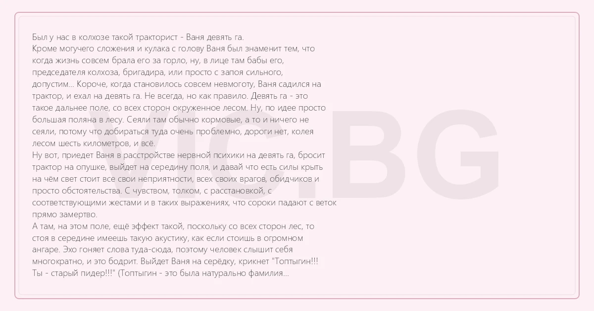 Был у нас в колхозе такой тракторист - Ваня девять га. Кроме могучего сложения и кулака с голову Ваня был знаменит тем, что когда жизнь совсем брала его за горло, ну, в лице там бабы его, председателя колхоза, бригадира, или просто с запоя сильного, допустим... Короче, когда становилось совсем невмоготу, Ваня садился на трактор, и ехал на девять га. Не всегда, но как правило. Девять га - это такое дальнее поле, со всех сторон окруженное лесом. Ну, по идее просто большая поляна в лесу. Сеяли там обычно кормовые, а то и ничего не сеяли, потому что добираться туда очень проблемно, дороги нет, колея лесом шесть километров, и всё. Ну вот, приедет Ваня в расстройстве нервной психики на девять га, бросит трактор на опушке, выйдет на середину поля, и давай что есть силы крыть на чём свет стоит все свои неприятности, всех своих врагов, обидчиков и просто обстоятельства. С чувством, толком, с расстановкой, с соответствующими жестами и в таких выражениях, что сороки падают с веток прямо замертво. А там, на этом поле, ещё эффект такой, поскольку со всех сторон лес, то стоя в середине имеешь такую акустику, как если стоишь в огромном ангаре. Эхо гоняет слова туда-сюда, поэтому человек слышит себя многократно, и это бодрит. Выйдет Ваня на серёдку, крикнет "Топтыгин!!! Ты - старый пидер!!!" (Топтыгин - это была натурально фамилия председателя колхоза) а эхо исправно повторяет "тыгин.. тыгин.. тыгин... пидер... пидер... пидер!" Ване легче сразу. То есть получается, что как бы всё вокруг, сама природа, относятся к нему с пониманием, сочувствием, с ним согласны и его поддерживают. И от этого Ваню отпускает. Такой вот незамысловатый аутотренинг. Не всегда Ваня доезжал до девять га. Мог и просто где придётся, если прижмёт, бросить трактор, выйти в чисто поле, и там, перекрикивая дизель, всех своих обидчиков наказать. Но эффект конечно не тот. Полного очищения не дает. Поэтому конечно чаще всего девять га. От этого и кличка соответствующая. Когда Ваню иногда незло на эту тему подначивали, Ваня ничуть не смущался, а очень внятно объяснял, что всё лучше в лесу проораться, чем свернуть в сердцах кому челюсть, и потом маяться совестью и сроком. А свернуть Ване, как я уже говорил, очень было чем. На вопрос кто его надоумил так отводить душу, Ваня говорил, что он ничего нового не выдумал, что так делали его отец, и дед, и прадед, и ещё фиг знает сколько коленов мужиков. Потому что по семейной легенде когда-то в незапамятные времена кто-то из предков, имея несдержанный характер и такие же пудовые кулаки, ударил обидчика и зашиб насмерть. За что и был сперва посажен в острог, а потом сослан в эти самые края. И от него якобы, от этого убивца, и пошел Ванин род и вот эта странная, но эффективная традиция. Выйти в чисто поле, и сказать всё что хочется. И самому хорошо, и потенциальным жертвам не в ущерб. Справка