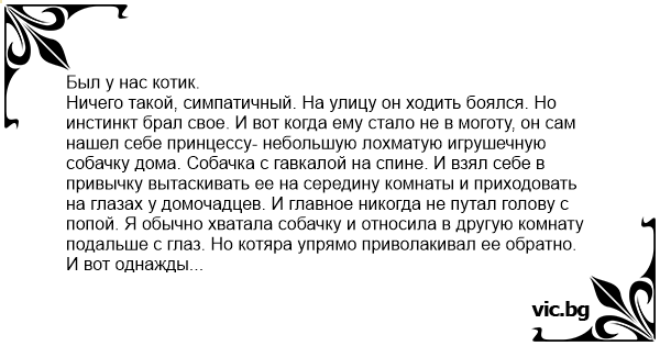 Был у нас котик. Ничего такой, симпатичный. На улицу он ходить боялся. Но инстинкт брал свое. И вот когда ему стало не в моготу, он сам нашел себе принцессу- небольшую лохматую игрушечную собачку дома. Собачка с гавкалой на спине. И взял себе в привычку вытаскивать ее на середину комнаты и приходовать на глазах у домочадцев. И главное никогда не путал голову с попой. Я обычно хватала собачку и относила в другую комнату подальше с глаз. Но котяра упрямо приволакивал ее обратно. И вот однажды он нечаянно надавил на гавкалку на спине собачки. Раздался лай. Котяра с выпученными глазами метнулся на спинку дивана, и до вечера не слезал. Я убрала игрушку подальше, закрутила в пакет и засунула в угол, думала все, отбила охоту. А фигушки. На утро наш котик, платонически мурлыкая притащил ее обратно. И....все возобновилось.