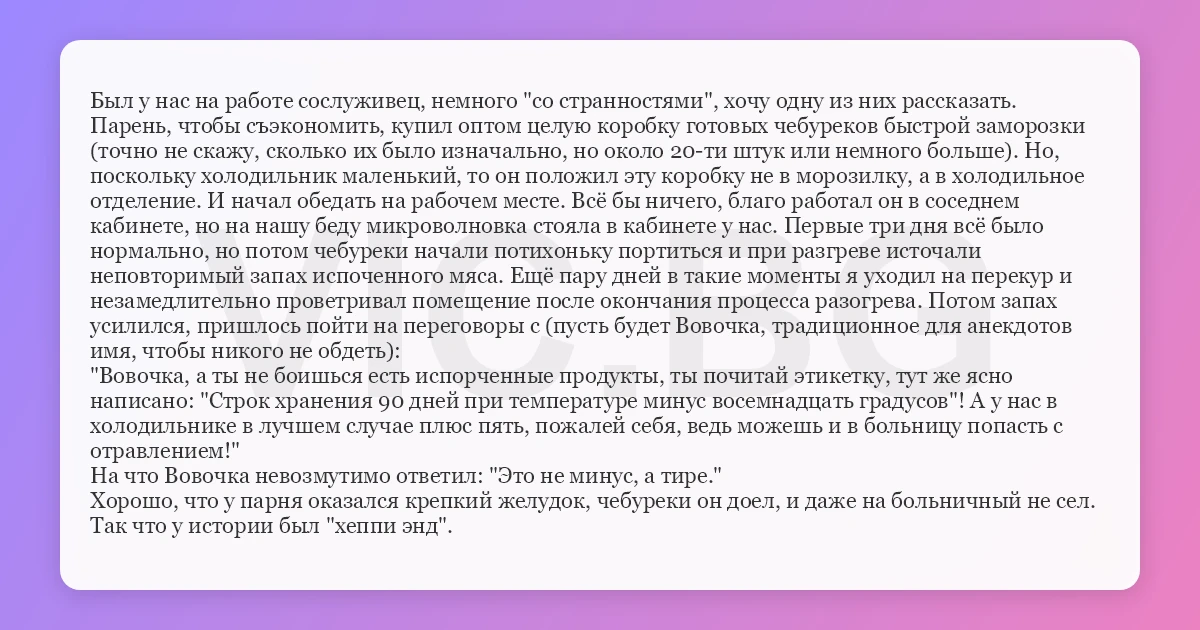 Был у нас на работе сослуживец, немного "со странностями", хочу одну из них рассказать. Парень, чтобы съэкономить, купил оптом целую коробку готовых чебуреков быстрой заморозки (точно не скажу, сколько их было изначально, но около 20-ти штук или немного больше). Но, поскольку холодильник маленький, то он положил эту коробку не в морозилку, а в холодильное отделение. И начал обедать на рабочем месте. Всё бы ничего, благо работал он в соседнем кабинете, но на нашу беду микроволновка стояла в кабинете у нас. Первые три дня всё было нормально, но потом чебуреки начали потихоньку портиться и при разгреве источали неповторимый запах испоченного мяса. Ещё пару дней в такие моменты я уходил на перекур и незамедлительно проветривал помещение после окончания процесса разогрева. Потом запах усилился, пришлось пойти на переговоры с (пусть будет Вовочка, традиционное для анекдотов имя, чтобы никого не обдеть): "Вовочка, а ты не боишься есть испорченные продукты, ты почитай этикетку, тут же ясно написано: "Строк хранения 90 дней при температуре минус восемнадцать градусов"! А у нас в холодильнике в лучшем случае плюс пять, пожалей себя, ведь можешь и в больницу попасть с отравлением!" На что Вовочка невозмутимо ответил: "Это не минус, а тире." Хорошо, что у парня оказался крепкий желудок, чебуреки он доел, и даже на больничный не сел. Так что у истории был "хеппи энд".