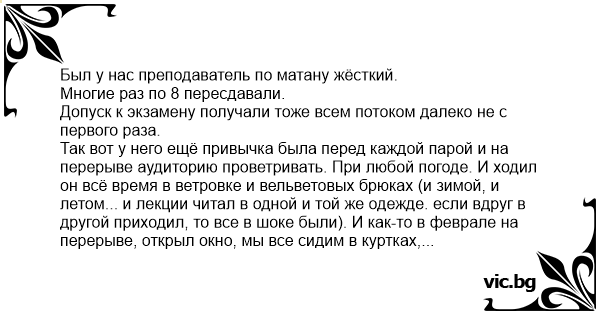 Так вот у него ещё привычка была перед каждой парой и на перерыве аудиторию проветривать. При любой погоде. И ходил он всё время в ветровке и вельветовых брюках (и зимой, и летом... и лекции читал в одной и той же одежде. если вдруг в другой приходил, то все в шоке были). И как-то в феврале на перерыве, открыл окно, мы все сидим в куртках, холодрыга, зуб на зуб не попадает, он стоит в своей ветровке (под которой надета только футболка) и говорит: