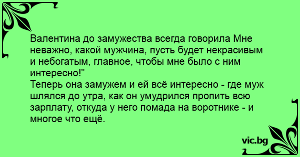Валентина до замужества всегда говорила Мне неважно, какой мужчина, пусть будет некрасивым и небогатым, главное, чтобы мне было с ним интересно!"