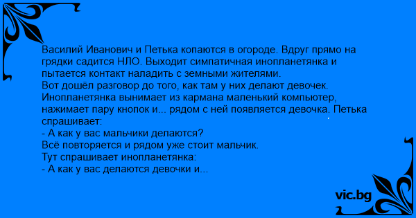 Вот дошёл разговор до того, как там у них делают девочек. Инопланетянка вынимает из кармана маленький компьютер, нажимает пару кнопок и... рядом с ней появляется девочка. Петька спрашивает: