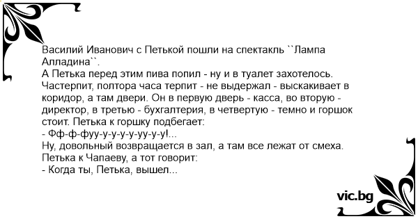 А Петька перед этим пива попил - ну и в туалет захотелось. Частерпит, полтора часа терпит - не выдержал - выскакивает в коридор, а там двери. Он в первую дверь - касса, во вторую - директор, в третью - бухгалтерия, в четвертую - темно и горшок стоит. Петька к горшку подбегает:
