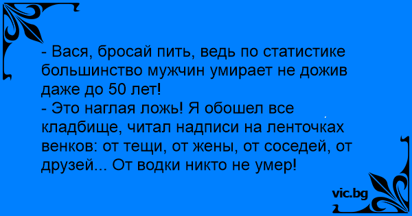 - Вася, бросай пить, ведь по статистике большинство мужчин умирает не дожив даже до 50 лет!