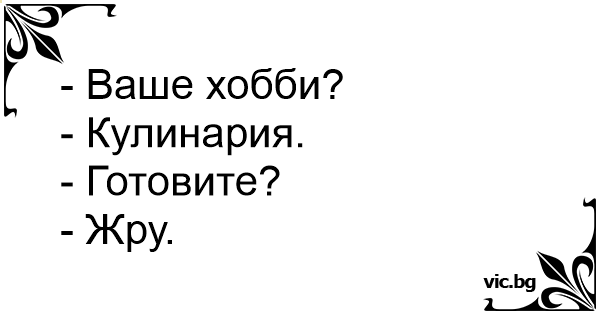 - Хоби? - Кулинария. - Готвите ли? - Ям