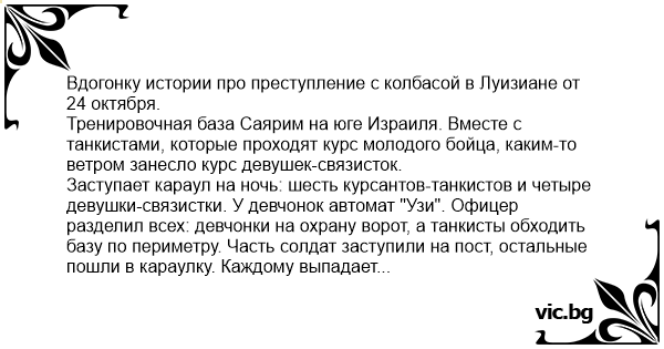 Заступает караул на ночь: шесть курсантов-танкистов и четыре девушки-связистки. У девчонок автомат "Узи". Офицер разделил всех: девчонки на охрану ворот, а танкисты обходить базу по периметру. Часть солдат заступили на пост, остальные пошли в караулку. Каждому выпадает дежурить по два часа. Ночь, скукота, время идет медленно... Офицер ночью просыпается, чтобы проверить все ли в порядке и обойти посты. Идет и глазам не верит: одной солдатки нет. Обходит будку и у него отвисает челюсть: солдатка сидит на корточках, штаны и трусы спущены до колен, и она занимается мастурбацией пламегасителем от "Узи". Причем рожок с патронами вставлен в автомат (караул все-таки). Кто знаком с "Узи" - знает, что его старые модели могут выстрелить от удара, падения и т.д. Девушка полностью поглощена своим занятием и не видит офицера. Офицер теряет дар речи, бледнеет, но потом все-таки решает отобрать опасную игрушку.