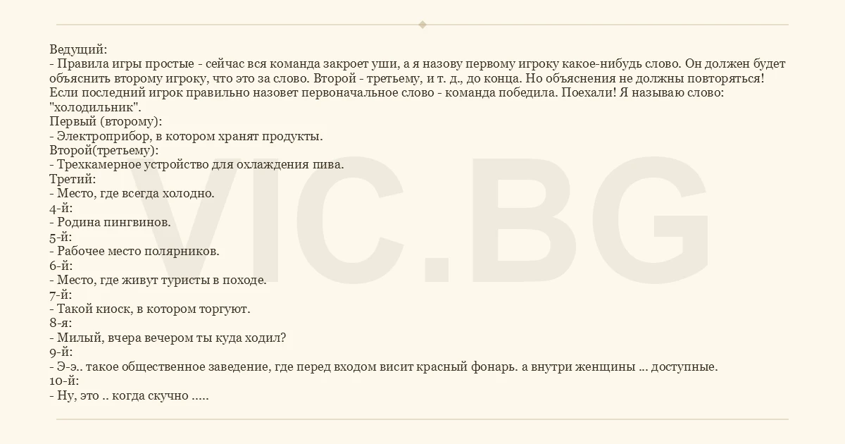 Ведущий: - Правила игры простые - сейчас вся команда закроет уши, а я назову первому игроку какое-нибудь слово. Он должен будет объяснить второму игроку, что это за слово. Второй - третьему, и т. д., до конца. Но объяснения не должны повторяться! Если последний игрок правильно назовет первоначальное слово - команда победила. Поехали! Я называю слово: "холодильник". Первый (второму): - Электроприбор, в котором хранят продукты. Второй(третьему): - Трехкамерное устройство для охлаждения пива. Третий: - Место, где всегда холодно. 4-й: - Родина пингвинов. 5-й: - Рабочее место полярников. 6-й: - Место, где живут туристы в походе. 7-й: - Такой киоск, в котором торгуют. 8-я: - Милый, вчера вечером ты куда ходил? 9-й: - Э-э.. такое общественное заведение, где перед входом висит красный фонарь. а внутри женщины ... доступные. 10-й: - Ну, это .. когда скучно .. 11-й: - Понял! Такое состояние, когда нечем заняться, нечем развлечься, хочется зевать. 12-й: - Ушла жена, пришла разлука, меня одолевает . . . . ..? 13-й: - Собака женского рода! 14-й: - Встречаются две собачки, одна - кобелек, а другая . . .? 15-й: - Когда встречаются две кошечки, они . . .? 16-й: - Что у слона в центре? 17-й: - Самое главное в семейной жизни. 18-й: - Холодильник!