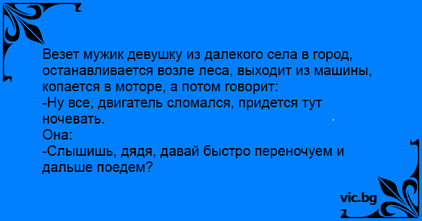 Везет мужик девушку из далекого села в город, останавливается возле леса, выходит из машины, копается в моторе, а потом говорит:
