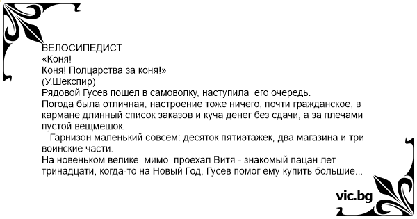 Вечерком, после ужина, рядовой Гусев вместе с велосипедом перелез через забор части, закурил и стал ждать мальчика Витю в заданном месте. Даже подарок ему приготовил - почти новый кожаный ремень, чтобы без обид обошлось.