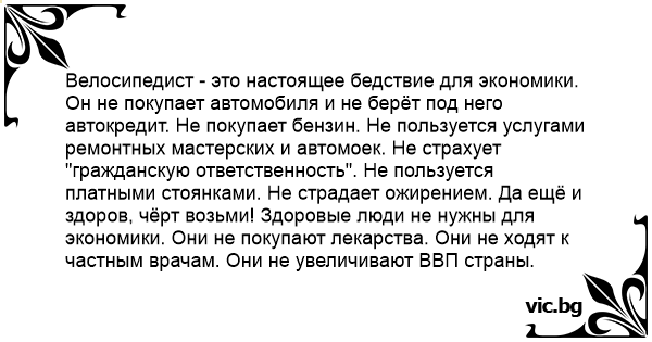 Он не покупает автомобиля и не берёт под него автокредит. Не покупает бензин. Не пользуется услугами ремонтных мастерских и автомоек. Не страхует "гражданскую ответственность". Не пользуется платными стоянками. Не страдает ожирением. Да ещё и здоров, чёрт возьми! Здоровые люди не нужны для экономики. Они не покупают лекарства. Они не ходят к частным врачам. Они не увеличивают ВВП страны.