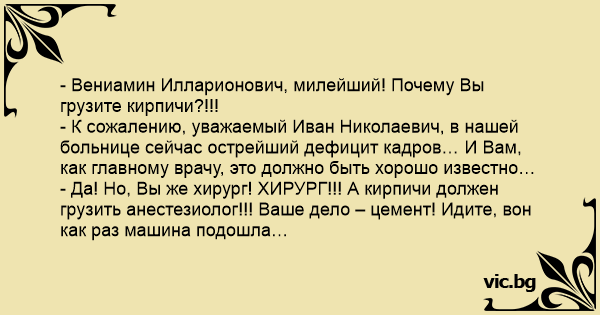 - Да! Но, Вы же хирург! ХИРУРГ!!! А кирпичи должен грузить анестезиолог!!! Ваше дело – цемент! Идите, вон как раз машина подошла…