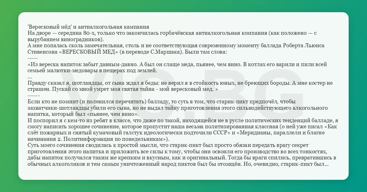 Результат: «Пять с минусом». И устное пояснение: «При написании сочинения ты не учёл, что народ пиктов проиграл решающую битву. Очень похоже, что они пришли на неё не в лучшей форме из-за, например, сильного похмелья... Мы же слушали на политинформации доклад о последствиях алкоголизма... Ты что, забыл?»