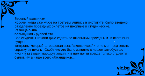 Веселый шовинизм Короче, когда уже курсе на третьем учились в институте, было введено разделение проездных билетов на школные и студенческие. Разница была большущая - рублей сто. Все студенты начали дико ездить по школьным проездным. В итоге был пущен контроль, который штрафовал всех "школьников" кто не мог предъявить справку из школы. Особенно это было заметно в нашем автобусе до института ( один маршрут ходил, и в нем почти всегда только студенты были). Ну а чаще всего обманщиков было по роже видно - щетина, борода, табачище, перегар с утреца - какой же ты школьник? И тогда я с другом пошел в свою бывшую школу и нам там по дружбе секретарь презентовала два чистых бланка с печатями, подтверждающие что податель сего учится в школе #14. "Сами, мол, заполните". Я вписал, что я "Дмитрий Мазин" - такой лошок действительно классе в 9-м учился, я его фамилию запомнил. Думал, типа в если что, в школу позвонят - подтвердят, что есть такой. А друг написал "Яков Исраэлевич Юровский" (как раз только фильм "Цареубийца" показали). Я говорю: нахер ты так подписался? Друг отвечает: "Чтобы все думали: у, cуka, жидюга, ряху отъел, а все по школьному проездному ездиет!!!" Автор - Волк.