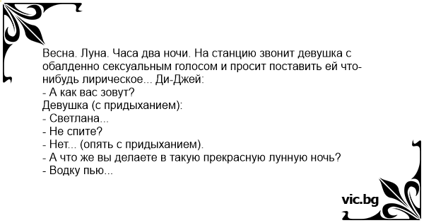 Весна. Луна. Часа два ночи. На станцию звонит девушка с обалденно сексуальным голосом и просит поставить ей что-нибудь лирическое... Ди-Джей: